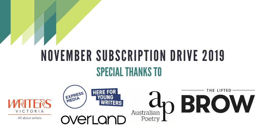 Not only are we offering a discount; if you subscribe or renew during the drive you will go into the running to win some amazing prizes to keep you reading all year round! Announced on November 15th, five lucky subscribers will receive a 12-month subscription to one of our amazing sister publications: The Lifted BrowAustralian Poetry JournalOverlandVoiceworks, and Writers’ Victoria Magazine!