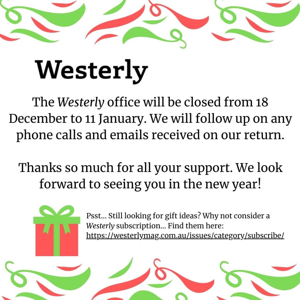 To all our contributors, readers, subscribers, followers and friends, we are hugely grateful for your involvement with Westerly! We hope you have enjoyed our publication this year, and that you stay in touch in the year to come.