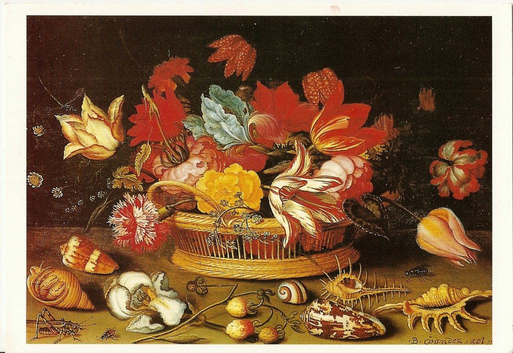 On the front of the postcard was a reproduction of an exquisite still life painted by the 17th century Dutch painter Balthasar van der Ast. Beneath a porcelain vase of flowers were scattered some exotically-patterned Pacific and Indian ocean seashells: a murex, a harp shell, a volute and several highly poisonous textile cone shells.