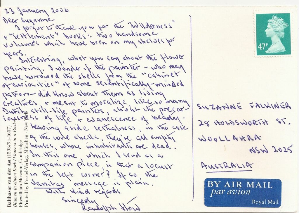 Postcard: Balthasar van der Ast (1593/94-1657), “Blumen in einem Korb”. Randolph Stow to author, 23 January 2006. Collection: Suzanne Falkiner