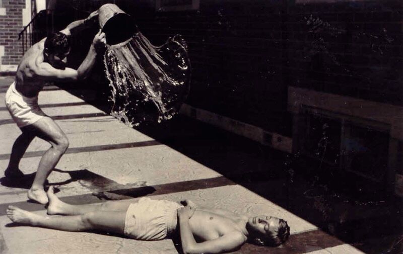 Helge Grant-Frost (brother of Stow’s room-mate Dieter) throws a bucket of water over fellow-student John Mitchell, while sun-baking on the top balcony of St George’s College. Collection: John Mitchell